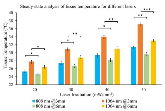 In this experiment, ex vivo tissue samples were photothermally heated by 808 and 1064 nm laser irradiation within the 20–50 mW·mm−2 range with a 50% increment rate. Thermocouples inserted into the tissue detected temperatures at 3 and 6 mm depth from the top surface. Maximum steady-state temperature and time were recorded for each laser irradiance. Results from the separate sets of experiments were compiled together in a single plot to facilitate the comparison of tissue photothermal heating at a fixed depth and laser irradiation for both wavelengths (Figure 6). Figure 6 represents the mean value of five experimental repetitions with an error bar representing one standard deviation (1σ). A graph showing the tissue temperature fluctuations vs. time is exhibited in Supplementary Materials (Figure S3).