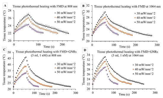 The purpose of this set of experiments was to evaluate the FMD’s effectiveness in the photothermal heating of ex vivo porcine pancreas tissue with and without a local GNR solution. The small size of the FMD tip (silica core area = 0.25 mm2) focused the high-energy laser to the specific tissue area, which resulted in rapid and concentrated heating. Concentrated irradiation caused tissue burning and carbonization at the FMD tip when the applied laser intensity was >60 mW·mm−2 or the exposure time was too long. Preliminary tests established the range of laser intensities (30–50 mW·mm−2) and exposure times (60 s) for both 808 and 1064 nm wavelengths to avoid tissue burning at the FMD tip. The results of these experiments are illustrated in Figure 7A–D. The first set of experiments (Figure 7A,B) evaluated FMD irradiation without GNRs while the next set (Figure 7C,D) explored irradiation with locally infused GNRs.