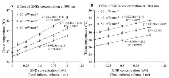 Figure 8 depicts the effect of GNR concentration on ex vivo tissue photothermal heating (t = 60 s) at 808 and 1064 nm for three laser irradiances (30, 40, and 50 mW·mm−2). A linear trend was observed between tissue temperature rise and GNR concentration (R2 = 0.98). Interestingly, the gradients at 808 nm were approximately 3–5 times higher than 1064 nm (for example, at 40 mW·mm−2 irradiation, the slopes were 12.1 ± 0.5 °C/nM and 3.2 ± 0.3 °C/nM at 808 and 1064 nm, respectively). Slopes of the trendlines for 1064 nm were nearly identical whereas they demonstrated a slightly increasing trend for 808 nm. The steeper slope at 808 nm indicates a higher degree of temperature increase for a small increment of GNRs concentration. It is evident that the 1064 nm temperature increase overreached the 808 only when no GNRs were present, but that GNR infusion had a far more significant effect on the 808 nm irradiation. It is also worth noting that, within the laser irradiances and GNR concentrations studied, there was no visible plateauing of the heating obtained. This indicates that these experiments did not reach a saturation point, or a concentration wherein nearly 100% of the light was absorbed, and that further increases would not lead to increases in absorption.