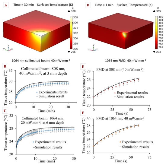 (A) Simulation results after 20 min of tissue photothermal heating by an 808 nm collimated beam with irradiance of 40 mW·mm−2; comparison between simulation and experimental results for collimated beams at (B) 808 nm, 40 mW·mm−2 irradiance, 3 mm tissue depth; (C) 1064 nm, 20 mW·mm−2 irradiance at 6 mm tissue depth; (D) simulation results after 1 min of tissue photothermal heating by FMD at 1064 nm, 40 mW·mm−2 irradiance; comparison of simulation and experimental results for FMD at (E) 808 nm, 40 mW·mm−2; (F) 1064 nm, 40 mW·mm−2 irradiances. Error bars represent mean ± 1σ (standard deviation) for n = 5 trials.