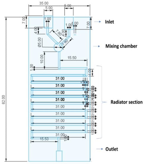 Microfluidic chips were designed with the following dimensions: 82 × 35 × 10 mm, including in one of the extremes, two inputs for the entrance of the solvent and aqueous phase, and in the opposite extreme, one output for the exit of the eluate (Figure 1). Both inputs and output were designed with the same dimensions of 5 mm in diameter and 7 mm in length. The channels through the whole chip were designed with a 1 mm diameter. Liquid flowing from each input channel was forced to join through a 90° angle intersection consisting of a 5 mm diameter circular chamber (mixing chamber). The chamber was followed by a mixing channel designed to mimic a radiator device shape consisting of 11 horizontal columns of 31 mm in length, separated from each other by 4 mm in length connectors. One vertical channels of 15.5 mm in length connected the mixing chamber with the radiator section and a second vertical channel of the same dimensions connected the exit of the radiator with the outlet port. To prevent leakage, a needle tip of 1 mm of diameter was inserted in each input.