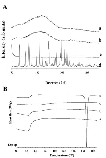 (A) XRD patterns and (B) DSC thermograms of lyophilized NFD polymeric nanoparticles. Key: (a) NFD polymeric nanoparticles prepared with an SLA printed microfluidic chip; (b) NFD polymeric nanoparticles prepared with FDM printed microfluidic chip; (c) NFD polymeric nanoparticles prepared with conventional evaporation method; (d) Unprocessed NFD.