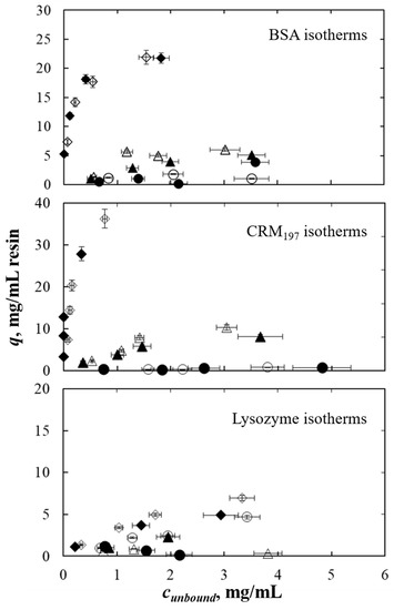 Adsorption isotherms were determined with a batch method in high-throughput mode. By using this methodology, a certain amount of protein is put in contact with a known amount of equilibrated resin until the equilibrium is reached in isotherm conditions at 25 °C. The total mass balance (Equation (1)), applied per each well, allows us to determine the value of adsorbed protein concentration. The values of loaded and unbound protein concentrations were measured.