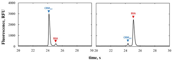 Electropherograms of binary mixtures of 90%CRM197-10%BSA (Sample 1), on the left, and 10%CRM197–90%BSA (Sample 2), on the right.