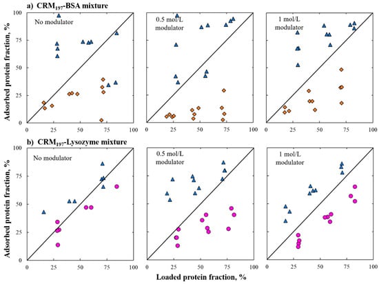 Parity plots describe the relationship between adsorbed and loaded protein fractions at different salt concentrations. Blue triangles represent CRM197 fractions, pink circles represent lysozyme fractions and orange diamonds represent BSA fractions. Section (a) BSA–CRM197 and section (b) CRM197–lysozyme mixture.