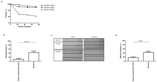 GlicoPro treatment induced a faster reconstitution of the scratch in the HCE-2 cell monolayer compared to the sodium hyaluronate 0.15% treated samples (p < 0.001; Student’s t-test) (Figure 1c,d).