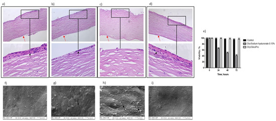 Histo-morphological analysis. Histo-morphological analysis of (a) control group corneal tissues; (b) dry eye; (c) control dry eye (100 µL sodium hyaluronate 0.15%), and (d) dry eye corneal tissues treated with GlicoPro for 24 h. Magnifications: 10× (upper panels), 60× (lower panel). Red arrows indicated endothelial cell layer; black arrows indicated stratified squamous epithelium. (e) Cell viability assessed by trypan blue staining. Scanning electron microscopy images of human corneal tissue in (f) control; (g) dry eye; (h) control dry eye (100 µL sodium hyaluronate 0.15%); and (i) GlicoPro-treated dry eye conditions. Each condition was analyzed in triplicate. Scale bars = 100 μm.