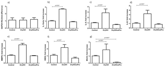 Quantitative reverse transcription polymerase chain reaction. Quantitative reverse transcription polymerase chain reaction results of (a) GAPDH, (b) interleukin (IL)-1 beta, (c) IL-6, (d) IL-8, and (e) matrix metallopeptidase-9 (MMP9), (f) defensin β-2 (DEFB2), (g) mucin (MUC)4 levels in corneal tissues under normal conditions (37 °C) and dry eye conditions (Dry) wit sodium hyaluronate 0.15% (SH) or with GlicoPro treatments. The results are expressed as the mean of triplicate experiments after 24 h of treatment. The data are presented as mean ± standard deviation. * significative p value.
