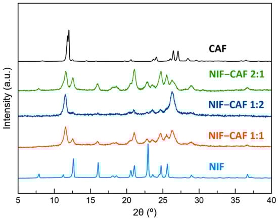 Powder X-ray diffraction (PXRD) patterns of the NIF and CAF physical mixtures obtained by neat grinding at different molar ratios, and the corresponding reactants.