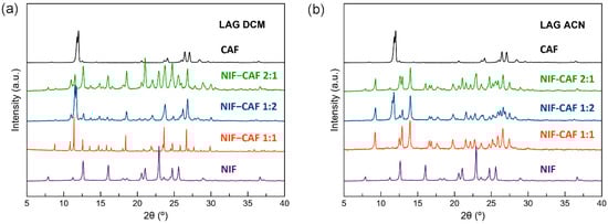 PXRD patterns of the two new solid forms obtained by liquid-assisted grinding (LAG) the two components at different molar ratios and in (a) dichloromethane (DCM) and (b) acetonitrile (ACN).