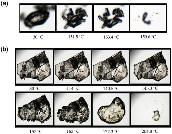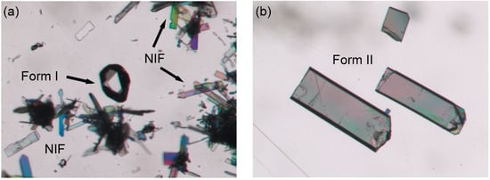 However, when Form I was subjected to the same heating ramp (Figure 16b), the growth of new crystals from the surface of the existing ones is observed at 140 °C, followed by the melting starting at 157 °C of the original crystals, leaving the new ones perfectly intact until they start to melt at 172 °C (niflumic acid melting point is 204 °C [52]).