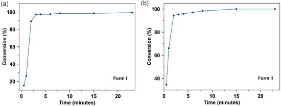 Interestingly, variable heating rate TGA analysis revealed from 30 °C to 165 °C a small weight loss of 1.3% in Form I (Figure 14a) and 0.8% in Form II (Figure 14b), suggesting a potential sublimation of both polymorphs, since sublimation of pure caffeine had been previously described [50], and destabilization of the caffeine/malonic acid cocrystal via sublimation had been also reported by Alsirawan et al. [51]. Thus, in order to gain a deeper insight into the thermal behavior of the polymorphic system, we conducted variable temperature powder X-ray diffraction in combination with optical thermomicroscopy experiments.