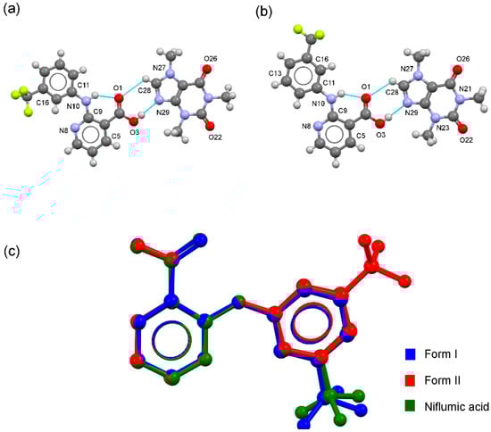 (a) Asymmetric unit of the Form I cocrystal. (b) Asymmetric unit of the Form II cocrystal. (c) Molecular overlay of the cocrystal polymorphs and the reported structure of niflumic acid.