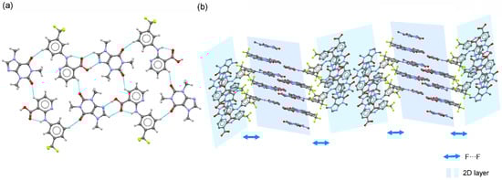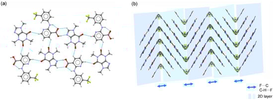 In Form I, the dimeric unit is further connected with two adjacent dimeric units through C–H···O hydrogen bonds involving the para-hydrogen atom of the anthranilic acid ring (C7–H7···O26). Pairs of chains are associated through additional C5–H5···O22 hydrogen bonds to form a tape structure that locate the –CF3 groups pointing into the tape, stabilizing the structure by C–H···F contacts. Tetrameric assemblies build by stacking interactions of type NIF···CAF···CAF··NIF connect the tape structures to form a 2D layer structure. Finally, F···C contacts and C–H···F as well as C-H···π interactions bind these layers to create the 3D structure (Figure 6).