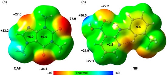 MEP surfaces (isovalue: 0.01 a.u.) of CAF (a) and NIF (b) at the PBE0-D3/def2-TZVP level of theory. The energies at selected points of the surfaces are given in kcal/mol.