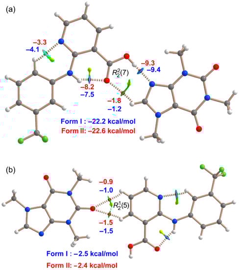 Intramolecular N–H···O=C and C–H···Npyridine hydrogen bonds keep the anthranilic acid fragment planar in the NIF molecules of the two cocrystal polymorphs. The main difference between them lies in the conformation of the NIF molecule. The rotation of the other aromatic ring around the N10–C11 bond gives rise to two conformers. The overlay of the NIF molecules in both polymorphs reveals that the two aromatic rings show a significant orientational difference in conformation due to the free rotation on the N–C bond (Figure 5c). Considering the torsion angle τ = C9–N10–C11–C16 as a reference, Form I displays the six-membered aromatic rings substituents (–CF3 and carboxylic acid) on opposite sides (τ = −173.51°), as observed in the reported structure of niflumic acid [43,44], whereas Form II locates them on the same side (τ = 8.26°). Thus, taking into account these conformational differences, NIF–CAF forms could be classified as conformational polymorphs. Nevertheless, this is not the only polymorphic class that could be used to describe the NIF–CAF system.