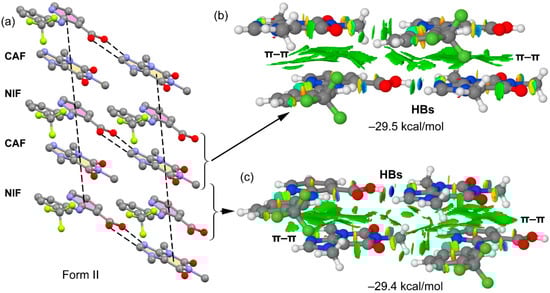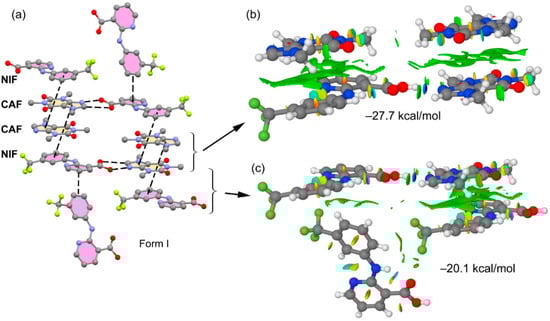 Figure 11a shows the X-ray packing of Form I, where the (7) H-bonded dimer interacts with two CAF molecules at one side of the supramolecular plane and two NIF molecules at the opposite side, forming discrete NIF···CAF···CAF···NIF assemblies. We have computed the binding energies of the tetrameric assemblies shown in Figure 11b,c and characterized them using the NCIplot index. It can be observed that the binding energies of these assemblies are significantly smaller (in absolute value) than those of Form II. Therefore, in terms of π-stacking interactions, Form II is significantly more stable than Form I. This result is in agreement with the experimental results observed in the stability study for both polymorphs (see Section 3.6).