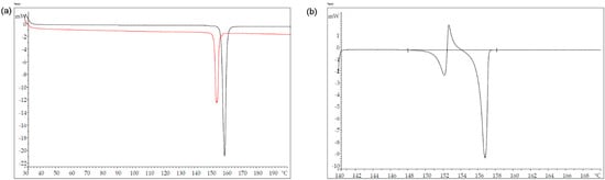 (a) DSC thermograms of Form I (black) and Form II (red) at a 10 °C/min heating rate. (b) DSC thermogram of Form II at a 1 °C/min heating rate.