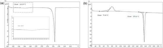 (a) DSC thermogram of Form II at a 0.2 °C/min heating rate. (b) DSC thermogram of the solid obtained by quenching from the melt of Form I.