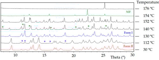 First, starting with Form II, we monitored its evolution by measuring PXRD diagrams at different temperature values and observed that it started to transform into Form I at around 112 °C and totally transformed at 130 °C, while a new crystal phase was detected at 140 °C, which, according to the simulated PXRD diagram from the crystal structure, corresponds to the niflumic acid. However, diffraction peaks of pure caffeine were not observed during the whole process. At higher temperature values, a decrease in the intensity of diffraction peaks of Form I together with an increase in those for niflumic acid was observed. Finally, at around 176 °C, diffraction peaks are not observable anymore, revealing the melt of the remaining niflumic acid (Figure 15).