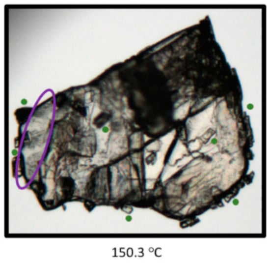 Microphotograph of a crystal of Form I when heated in on a hot-stage instrument at 150.3 °C. Sublimation area is highlighted in purple and new crystals of niflumic acid are located at the green points.