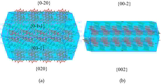 BFDH morphologies of each polymorph were calculated by using the Bravais–Friedel–Donnay–Harker (BFDH) method included in the latest release of the visualization software package Mercury [53] in order to detect significant differences that could explain the different behavior regarding the recrystallization of niflumic acid on the surface of the cocrystal. In the case of Form I (Figure 18a), the predicted morphology shows only caffeine molecules pointing out of the {020} and {0-20} faces (corresponding to 31% of the total surface), and both caffeine and niflumic acid molecules at the {011}, {01-1}, {0-1-1}, and {0-11} faces (corresponding to 34% of the total surface). On the other hand, in Form II, only niflumic acid molecules are located at all the faces of the predicted morphology (Figure 18b). Thus, the total absence of caffeine molecules at the predicted faces of Form II as opposed to Form I can have an impact on the surface properties of each polymorph, preventing caffeine sublimation in Form II, which could provide a plausible explanation of the observed differences on the nucleation and growth of niflumic acid crystals.