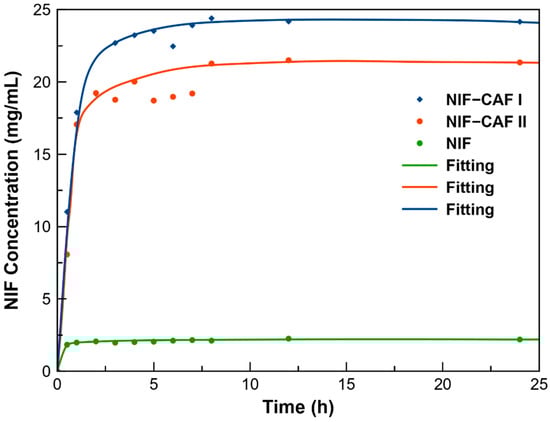 Powder dissolution profile of NIF–CAF cocrystal polymorphs and NIF, and the corresponding fitting curves (solid lines).