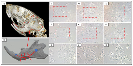 Overview graphic for dental pulp site on CT rendering (a) and reconstructed mandibular 3D model (b). Cultured cell isolates from αMEM-cultured cells from both enzymatic (c,f,i) and tissue outgrowth (d,g,j) methods and DMEM/F12-cultured cells using tissue outgrowth method (e,h,k). Phase contrast culture images are displayed at 5× (c–e), 10× (f–h), and 20× (i–k) magnifications.
