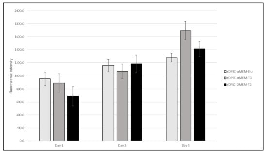 Alamar Blue proliferation data for rDPSC populations cultured in α-MEM-, both enzymatic and tissue outgrowth methods, and DMEM-based growth mediums.