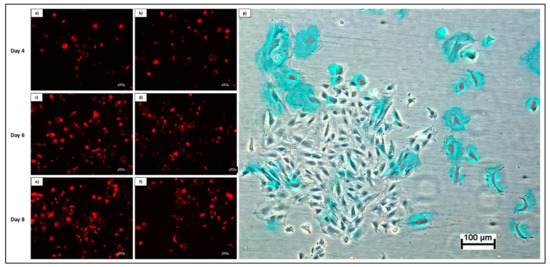 To generate readily trackable cell populations, lentiviral transduction was performed on DMEM/F12-cultured rDPSC populations, resulting in fluorescent cells that could be applied to and monitored on biomaterials, confirming cell presence and density. The establishment of these fluorescent cultures further offered the potential to derive ECM protein-rich gel additives for thermoplastic skeletal constructs that were bio-active and could be observed under fluorescent microscopy, as displayed in Figure 6. Notably, cells that had been recently transduced grew substantially slower as compared with non-transduced populations at the same passage and density. This was expected to be related to viral load stress, and cells were supplemented with additional FBS to compensate [49]. Despite the increased FBS concentration, over culture time post-transduction cultures tended to see increases in the non-fluorescent cell sub-population percentage. As the cells expressing the DsRed morphologically appeared healthy, the increasing percentage of non-fluorescent cells may have simply been indicative of a more rapid proliferative capacity of cells that were not virally transduced. Alternatively, the observed subset population of low-expressing CD90 cells, indicated in Table 4, for DMEM/F12-cultured cells, may account for non-transduced cells, as CD90+ populations have been described to promote enhanced transduction potential [50,51]. Furthermore, the multiplicity of infection used for the transduction was determined based on previous transductions of rat MSCs derived from adipose and bone-marrow tissue and was anticipated to have an efficiency above 80%.