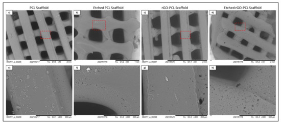SEM imaging of etched (b,d,f,h) and unetched (a,c,e,g) PCL and rGO-PCL constructs at low (a–d) and high (e–h) magnification. Red dashed line boxes on low magnification images indicate the zone being magnified for each scaffold type.