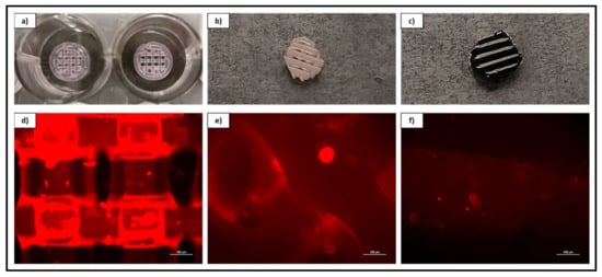 Overview and magnified (10×) fluorescent imaging of acellular 40% w/v PF-127 bio-ink containing ECM derived from rDPSC-R as a standalone printed lattice structure (a–d) and coating both a PCL (b–e) and rGO-PCL (c–f) construct.