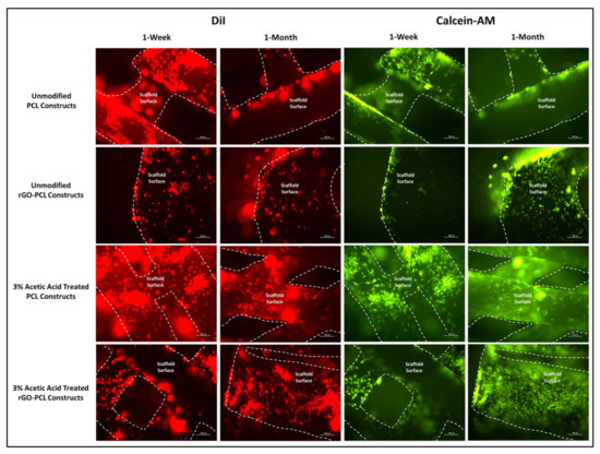 rDPSCs seeded on PCL and rGO-PCL constructs, both unmodified and etched with 3% acetic acid, under fluorescent imaging at 10× magnification. DiI-labeled and Calcein-AM-stained cells are shown with scaffold surfaces highlighted via dashed lines. Cell populations on scaffolds were assessed at both 1-week and 1-month time points.