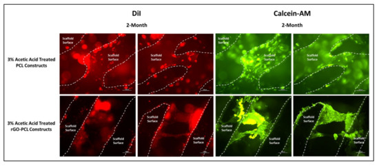 rDPSCs cultured for 2 months on PCL and rGO-PCL constructs etched with 3% acetic acid, under fluorescent imaging at 10× magnification. DiI-labeled and Calcein-AM-stained cells are shown with scaffold surfaces highlighted via dashed lines.