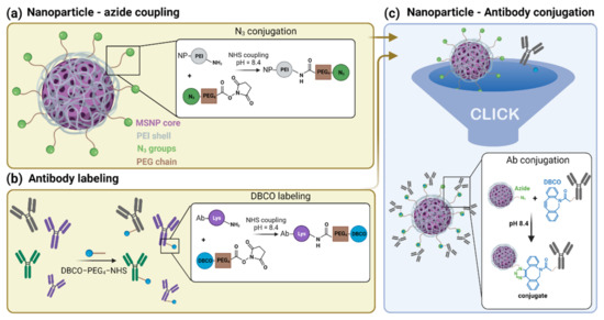 Covalent attachment is achieved by functionalizing the nanoparticle surface with functional groups (e.g., amine, carboxylic, maleimide etc.), which can react with the amino acid side chain of the antibody by standard conjugation methods. Covalent attachment of antibodies is generally preferred, provided that an appropriate approach is used. For instance, while EDC/NHS coupling is a common method for covalent attachment [40], it can result in oligomerization of antibody molecules [41]. Furthermore, some conjugation methods require the use of catalysts, often metals, that can lead to increased toxicity of the nanoparticles if not fully removed from the solution [42,43]. Therefore, when using covalent conjugation, a catalyst-free approach and vast optimization are important. Despite the progress in nanoparticle functionalization, there is still an urge for simple and reproducible strategies to conjugate antibodies to nanoparticles, enabling the development of versatile DDSs, which can easily be customized for selectivity towards different cancer markers.
