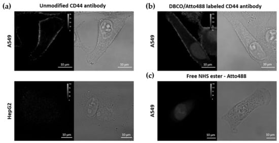 Immunofluorescence (IF) using (a) the unmodified primary rat anti-human CD44 antibody and a secondary donkey anti-rat IgG Alexa Fluor 488 antibody on A549 and HepG2 cells, (b) dual DBCO/Atto488-labelled CD44 antibodies in A549 cells and (c) free NHS ester-Atto488 molecules. Scale bar is 10 µm.