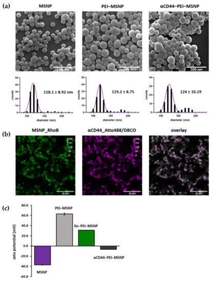 The antibody was covalently linked on the nanoparticle via copper-free click chemistry between the Azide moiety and the DBCO-labelled antibody (generating αCD44-PEI-MSNPs, Figure 1c). The developed nanoparticles were characterized using scanning electron microscopy (SEM), atomic force microscopy (AFM), zeta potential measurements, and fluorescence microscopy.