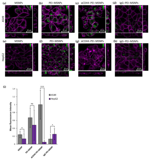 Confocal fluorescence microscopy images showing the influence of different MSNP coatings on the uptake of nanoparticles in A549 and HepG2 cells. Internalization of bare MSNP (a,e), PEI-coated MSNPs (PEI-MSNP, panels (b,f)), CD44-functionalized MSNPs (αCD44-PEI-MSNP, panels (c,g)), and IgG-functionalized MSNPs (IgG-PEI-MSNP, panels d,h) in A549 cells (a–d) and HepG2 cells (e–h). Nanoparticles were loaded with Fluorescein (FITC, green) and the plasma membrane was stained with DiR (magenta). The central square represents a single xy plane, while the bottom and left panels are the xz and yz cross-sections, indicated by the dashed lines. Scale bar is 20 μM; color bars display the intensity values. (i) Normalized mean fluorescence intensity of MSNP, PEI-MSNP, αCD44-PEI-MSNPs, and IgG-PEI-MSNPs internalized in A549 and HepG2 (20 cells per condition). The data were analyzed using Fiji (see Methods section for details). With ns: not significant, * (p < 0.05), *** (p < 0.001).