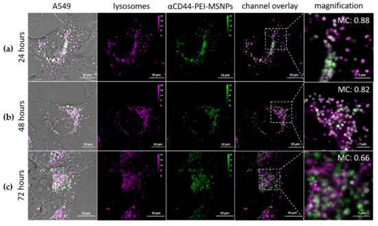 One of the main bottlenecks faced by DDSs is their entrapment in acidic vesicles and subsequent degradation, significantly limiting the overall efficiency of the DDS [82,83,84]. To this end, strategies have been developed to facilitate an endosomal escape, releasing the nanoparticles (or their cargo) into the cytoplasm. We previously showed that the addition of a PEI shell leads to the release of the nanoparticles in the cytoplasm [49]. To verify that conjugation to an antibody does not affect the endosomal escape capability of the PEI layer, the co-localization of αCD44-PEI-MSNPs with lysosomes was monitored using fluorescence microscopy. Briefly, A549 cells were incubated with RhoB-loaded αCD44-PEI-MSNPs for 24 h, after which the medium of the samples was refreshed, in order to avoid further nanoparticle internalization (i.e., only nanoparticles that were endocytosed within the first 24 h of incubation were followed). At each time point (24, 48 and 72 h after particle addition), the acidic vesicles were stained with LysoTracker Deep Red and the samples were imaged. Figure 5 shows representative fluorescence images at the different time points. To quantify the co-localization between the acidic vesicles and the αCD44-PEI-MSNPs through time, the Manders’ co-localization coefficient was calculated (Figure S6, Supplementary Materials). Briefly, an intensity-based threshold was used to calculate the areas of the image corresponding to nanoparticles and to lysosomes. The Manders’ coefficient (MC) calculates the degree of overlap between objects in different channels (with 0 being no overlap and 1 indicating a complete overlap). Fluorescence images showed that, within 24 h, almost all nanoparticles were located inside the acidic vesicles (Figure 5a). While at 24 and 48 h, no relevant escape was observed with MC of 0.88 and 0.82 (Figure S6), a significant decrease in the co-localization of nanoparticles and lysosomes was found after 72 h (MC of 0.66), indicating that after 72 h a considerable number of αCD44-PEI-MSNPs were localized outside the lysosomes (Figure 5c). Overall, these results suggest that the presence of αCD44 on the surface of the nanoparticles does not affect the endosomolytic activity of the PEI coating as most of nanoparticles were able to dissociate from the lysosomes within 72 h. This was validated by the significant difference in MC found between 48 and 72 h (Figure S6). The endosomal escape rate was, however, slower than MSNPs coated with only PEI, where the majority of the particles escaped the lysosomes within 48 h (previously reported by our group [49]). Since the proton sponge effect is linked to the amine groups of the PEI, this delay might be associated with the reduced number of amine groups available, as part of these are used for N3 functionalization and further coupling to the antibodies.