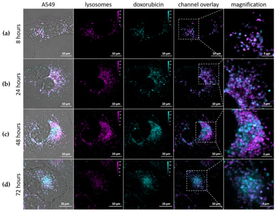 As shown in the previous section, a considerable number of the internalized αCD44-PEI-MSNPs were able to escape the acidic vesicles. Aside from the ability to escape the lysosomes, a higher efficiency requires that enough cargo can be released into the cytoplasm in a controlled fashion. To monitor the drug release after cellular uptake, doxorubicin was used as drug model and encapsulated in the pores of MSNPs prior to coating (αCD44-PEI-MSNPs_Dox). Dox is a cytostatic anticancer drug that is used to treat different types of cancer, for instance, leukemia, lymphoma, and breast cancer. Its mechanism of action is based on the intercalation with the DNA, resulting in cell death [85]. Due to the fluorescent nature of Dox, its intracellular localization could be monitored over time with confocal fluorescence microscopy. To show that αCD44-PEI-MSNPs_Dox carried Dox into the target cell and exhibited a controlled intracellular drug release, A549 cells were incubated with αCD44-PEI-MSNPs_Dox for 8, 24, 48 and 72 h. To avoid further nanoparticle internalization, the medium of the samples was refreshed 24 h after the addition of the nanoparticles. The acidic compartments were stained with LysoTracker Deep Red (magenta, Figure 6) to analyze the cargo (Dox, cyan) release/leakage from the lysosomes. While after 8 and 24 h, most of the Dox was still retained inside lysosomes (indicated by the high overlap between the Dox and the lysosomes, Figure 6a,b), increasing amounts of Dox discharged into the cytosol were observed after 48 and 72 h (Figure 6c,d). The overlap between the acidic vesicles and Dox molecules at 8 and 24 h indicated that, at this time point, Dox was presumably still inside the pores of the MSNPs or being slowly released inside the acidic vesicles. At an acidic pH, the silica hydroxyl groups are protonated, hindering the electrostatic interaction between the PEI and the silica surface. Therefore, we hypothesized that the decreased pH inside the lysosomes aids in the release of the shell and facilitates the consequent Dox release from the mesoporous silica pores. Accordingly, increasing amounts of Dox were detected in the cytoplasm over 48 to 72 h (Figure 6c,d). Moreover, as shown in Figure 6d, the cells’ morphology suggested cellular death, indicating that the cells were being killed by the successful release of the drug.