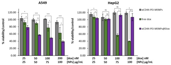 Viability of A549 and HepG2 cells after 72-h incubation with different concentrations of free Dox, Dox-loaded αCD44-PEI-MSNPs, and empty αCD44-PEI-MSNPs. A549 and HepG2 cells that were not incubated with particles or drug were used as a control and represent 100% viability (data not shown). Dox concentrations are expressed in nM while nanoparticle concentrations are in µg/mL. Estimated Dox concentration loaded in the nanoparticles was 50 μM. Error bars indicate ± SD, with ns meaning not significant; * (p < 0.05), ** (p < 0.01), and *** (p < 0.001), n = 4.