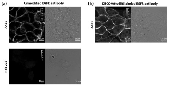 Immunofluorescence (IF) using (a) the unmodified primary mouse anti-human EGFR antibody followed by a labelled secondary antibody, goat anti-mouse IgG AF488, on A431 and Hek293 cells; (b) DBCO/Atto565-labelled EGFR antibodies in A431 cells. Scale bar is 10 µm.