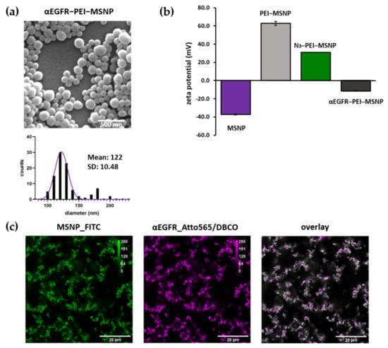 Similar to αCD44-conjugated particles, αEGFR-PEI-MSNPs displayed a uniform size and shape homogeneity (Figure 9a). With a mean diameter of 122 nm (as derived from the SEM data), αEGFR-PEI-MSNPs were significantly bigger than the PEI-MSNPs (Figure 3a) (p < 0.05) because of the EGFR layer. AFM measurements revealed an average nanoparticle diameter of 127 nm, which agreed with the SEM results (Figure S3). Zeta potential measurements were performed to check the different steps of nanoparticle functionalization. The zeta potential data of the bare MSNPs, PEI-grafted MSNPs (PEI-MSNPs), and Azide-conjugated MSNPs (N3-PEI-MSNPs) were already discussed in Section 3.1.3. (Figure 3c). The αEGFR-PEI-MSNPs displayed a negative zeta potential (−11.6 mV), similar to the one of the MNSPs after conjugation with the CD44 antibody (αCD44-PEI-MSNPs, −6.7 mV) (Figure 9b). Additionally, in order to confirm uniform binding of the EGFR antibody, MSNPs were encapsulated with a fluorescent dye (FITC), while the EGFR antibody was labelled with another dye (Atto565). Accordingly, the co-localization between the EGFR antibody and the MSNPs could be determined via confocal fluorescence microscopy measurements. These data confirmed proper attachment of the EGFR antibody and uniform coverage of the nanoparticles with antibody molecules (Figure 9c).