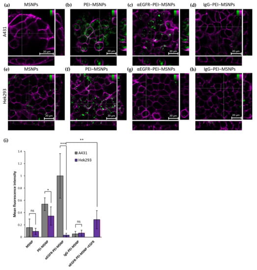 The uptake of nanoparticles with different coatings (MSNPs, PEI-MSNPs, αEGFR-PEI-MSNPs, and IgG-PEI-MSNP) was compared between A431 (epidermoid carcinoma with high EGFR expression [86]) and Hek293 cells (human embryonic kidney cells with low EGFR expression [91]). In agreement with the results of the preceding experiment, bare MSNPs were internalized in A431 and Hek293 in a low amount (Figure 10a,e), and a similar increase in uptake could be detected for MSNPs with a PEI layer (Figure 10b,f). As predicted, conjugation of the EGFR antibody resulted in a significant discrepancy in particle uptake between A431 and Hek293 cells (Figure 10c,g,i). Hek293 displayed a similar uptake behavior for the αEGFR-PEI-MSNPs and the bare MSNPs (Figure 10g) while, in A431 cells, there was an obvious increase in the number of αEGFR-PEI-MSNPs internalized, especially when compared to bare MSNPs (Figure 10c). This increase can be attributed to the specific recognition of the EGFR receptor by the αEGFR-PEI-MSNPs, proving cell specificity of these nanoparticles. Similar to A549 and HepG2, the incubation of A431 and Hek239 cells with the non-specific IgG-conjugated nanoparticles resulted in an internalization comparable to bare nanoparticles. As mentioned in Section 3.2.2, this is a consequence of the non-specificity of the IgG towards membrane proteins expressed in these cell lines and the negative zeta potential (−11.8 mV) of the resulting IgG-conjugated nanoparticle (minimum non-specific uptake). To further evaluate the specificity of the antibody-conjugated nanoparticles, expression of the EGFR receptor in Hek293 was induced by transiently transfecting Hek293 cells with a plasmid encoding an EGFR-HaloTag® fusion construct (see Methods section for details). A fluorescent ligand (Alexa Fluor 488 HaloTag® ligand) was used to identify the EGFR-expressing Hek293 cells via confocal fluorescence microscopy (Figure S7 in Supplementary Materials). Quantitative analysis of the fluorescence intensity revealed that Hek239 cells expressing EGFR molecules exhibited a higher uptake of αEGFR-PEI-MSNPs (Figure 10i). This demonstrates that the internalization of αEGFR-PEI-MSNPs is linked to the presence of the EGFR receptor on the cell membrane, further confirming the selectivity of the developed nanoparticles.
