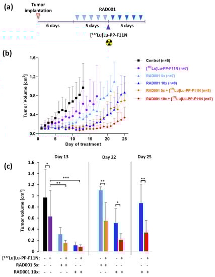 Tumor growth inhibition in RAD001 and [177Lu]Lu-PP-F11N-treated mice. (a) Experimental design: after the implantation of A431/CCKBR cells into nude mice, 5 or 10 doses of RAD001 were administrated alone or in combination with 60 kBq [177Lu]Lu-PP-F11N, as indicated. (b) Tumor growth curves of control and treated groups. Data represent mean ± SD. (c) Bars represent average tumor volumes ± SD on day 13, 22, and 25 after treatment initiation. * p < 0.05, ** p < 0.01, *** p < 0.001.