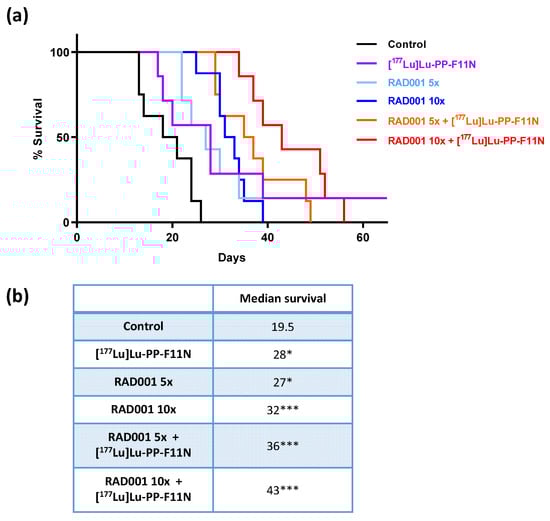 Prolonged survival in RAD001 and [177Lu]Lu-PP-F11N-treated mice. (a) Survival rates presented as Kaplan–Meier curves of the control and treated mice. (b) Significantly extended median survival in treated groups, compared to the control group. * p < 0.05, *** p < 0.001.