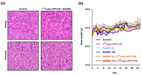 To check the potential toxicity of [177Lu]Lu-PP-F11N to healthy organs, kidney and stomach from control (PBS), and 10× RAD001 and [177Lu]Lu-PP-F11N-treated mice were harvested 13 and 25 days after radiopeptide injection, respectively, and subjected to hematoxylin and eosin (HE) staining. Tissue sections from mice that had received a combinatory treatment did not show any differences compared to the untreated controls (Figure 3a), excluding the acute radiation toxicity to stomach and kidney. During therapy, body weight continuously increased, and no significant differences between control and treated mouse groups were noted (Figure 3b).