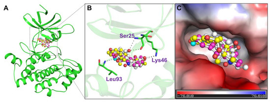 The selected compounds’ binding modes and interaction patterns were analyzed utilizing PyMOL and Discovery Studio visualizer. The analysis of compounds was done based on interacting residues. We employed Discovery Studio and PyMOL to identify and visualize hydrogen bonding and other interactions of the compounds with CK1α. It was found that residues of the kinase domain of CK1α offer a significant number of interactions, such as Ser25, Lys46, and Leu93 (Figure 2). The ATP binding site, i.e., Lys46, was also found to make direct contact with the docked compounds, which is crucial for the CK1α activity (Figure 2B). All three compounds were found to be fit within the binding pocket of CK1α with a good complementarity (Figure 2C).
