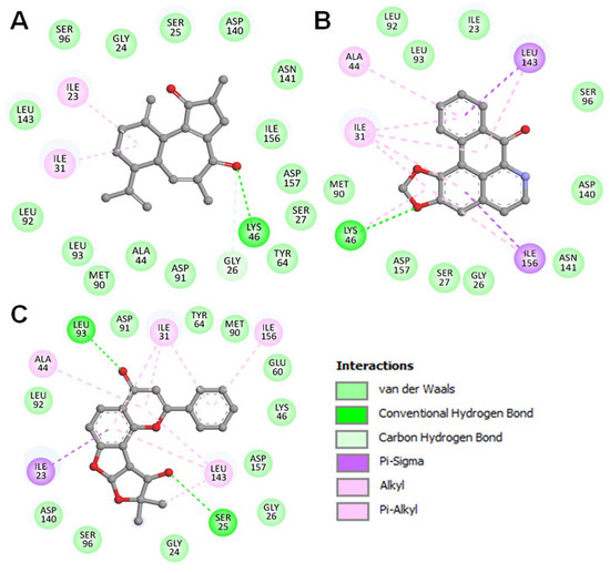 The detailed binding analysis showed that the interaction of all three compounds was in the ATP binding pocket, where several crucial residues of CK1α participated in the interaction (Figure 3). The binding of all three compounds with CK1α was stabilized by several interactions, including four conventional H-bonds, one carbon-H bond, and a few hydrophobic interactions. The plot showed that two H-bonds stabilized the CK1α-Curcusone_A complex with Gly26 and Lys46, two Alkyl bonds with Ile23 and Ile31, along with 15 Van der Waals interactions (Figure 3A). While one H-bond stabilized the CK1α-Liriodenine complex with Lys46, two Alkyl bonds with Ile31 and Ala44, along with two Pi-sigma bonds with Leu143 and Ile156, and 10 Van der Waals interactions (Figure 3B). At the same time, the CK1α-Semiglabrinol complex was stabilized by two H-bonds with Ser25 and Ile93, along with several other interactions (Figure 3C). The stable binding of the elucidated compounds with the ATP-binding site might be vital to inhibit the kinase activity of CK1α and raise them as “competitive inhibitors” of CK1α.