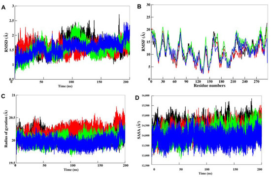 The apo CK1α and its complexes with the selected ligands prepared through the molecular docking approach were used as initial coordinates in the MD simulation study. The all-atom MD simulations were performed through the AMBER 18 package [64]. The FF14SB AMBER force field [65] was used for the receptor protein, and appropriate charge and protonation state were prepared through the Protein Preparation Wizard implemented in the Schrödinger suite. The GAFF force field [66] was utilized for the ligands, and the AM1-BCC model [67] was used in parameterization and adding charges. The topology and atomic charges of the compounds were generated through the Antechamber utility of the AMBER 18 package. The topology and coordinates of the complex systems were generated through the leap module of AMBER 18. The solvation of all the systems was performed in a virtual box of the TIP3P water model [68]. An appropriate number of counterions was supplied for the neutralization of the systems. To deal with the hydrogen bonds and long-range electrostatic interactions, the SHAKE algorithm and the particle mesh Ewald (PME) was espoused, respectively. The energy minimization of all the systems was carried out using 10,000 steps of the steepest descent algorithm. Each system was gradually heated from 0 to 300 K for 100 ps. Afterward, the equilibration of each system was performed for 100 ps at 300 K and constant pressure. Lastly, a production run for 200 ns for each system was performed at constant temperature and pressure. The resultant trajectories were explored using the CPPTRAJ module [69]. The RMSD, RMSF, Rg, SASA, H-bonds, secondary structure analysis, distance cross-correlation matrix, and PCA were analyzed from the generated outputs.